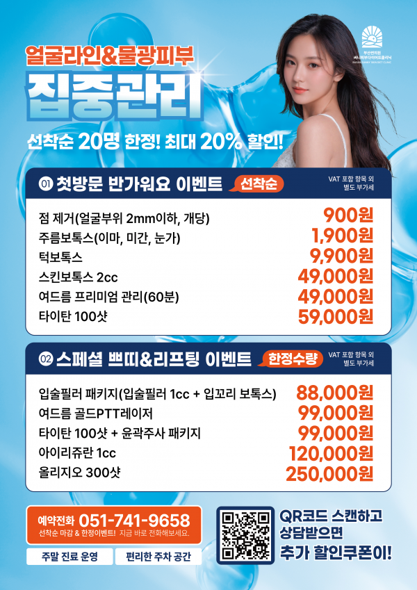 피부이벤트 페이지 정보 작성자써니클리닉 등록일 2025-09-08 10:06 조회61 본문 피부이벤트 목록 이전글다이어트이벤트 25.09.08 다음글민생회복지원금안내 25.07.18